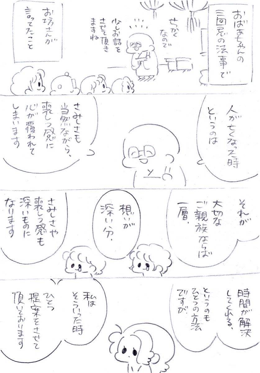 おばあちゃんの法事の時にお坊さんが〝人が亡くなった時に親族が一番ほしいものは何か〟という話をしてくれました。私もノートを置いておこうと思います