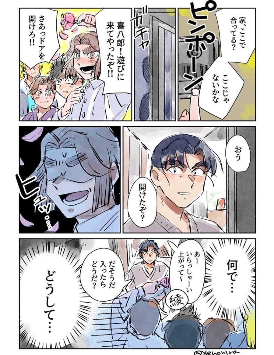 現パロ、六い+アヤベ「キハチローから家に遊びに来なよって誘われただけなのに玄関で土下座することになった件」